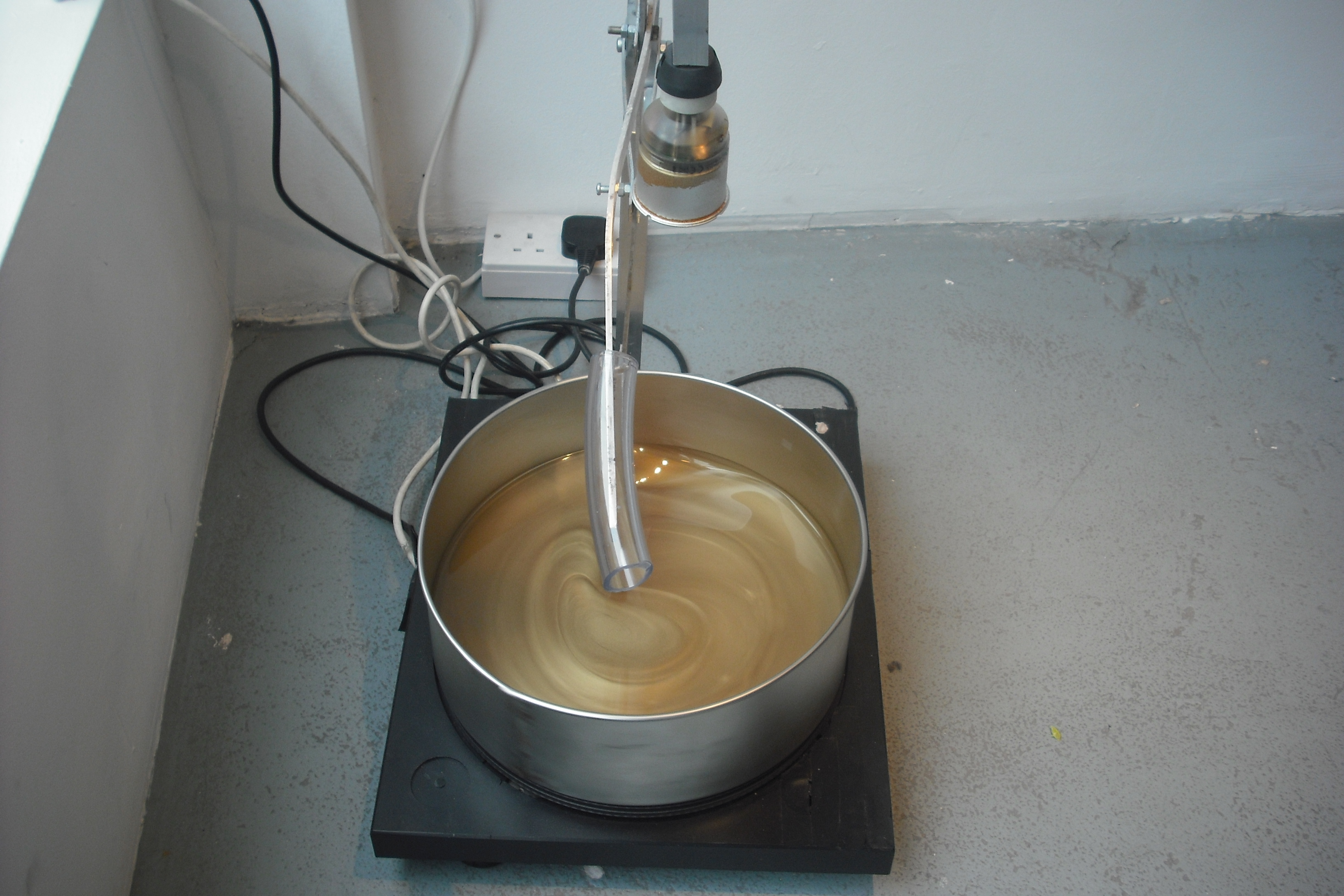 Besides the current time in history to which these works may refer, time is built within Glaser’s work. The motion of the turntable is not only performing, it is preventing a change of state as the liquid will solidify eventually if left, much like the effect of switching off a Marc Quinn self portrait in frozen blood although changing state in the opposite direction.