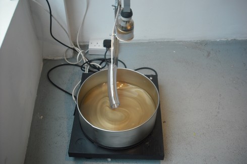 Denis Glaser’s Gold, his last work made shortly before passing away at the beginning of the year, on exhibition at Fordham Gallery‘s exhibition at Maddox Arts likewise uses golden materials. In this piece gold paint or liquid gold is constantly stirred as its container rotates on a record turntable, seemingly awaiting purpose, perhaps also the wedding. Meanwhile it could be seen as a critique of the burgeoning Money for Gold industry sprouting across television advertising, for which those behind the businesses are only interested in the scrap values of gold, melting it down, though investigations by BBC programme Rip Off Britain have shown a price much below this is often offered.