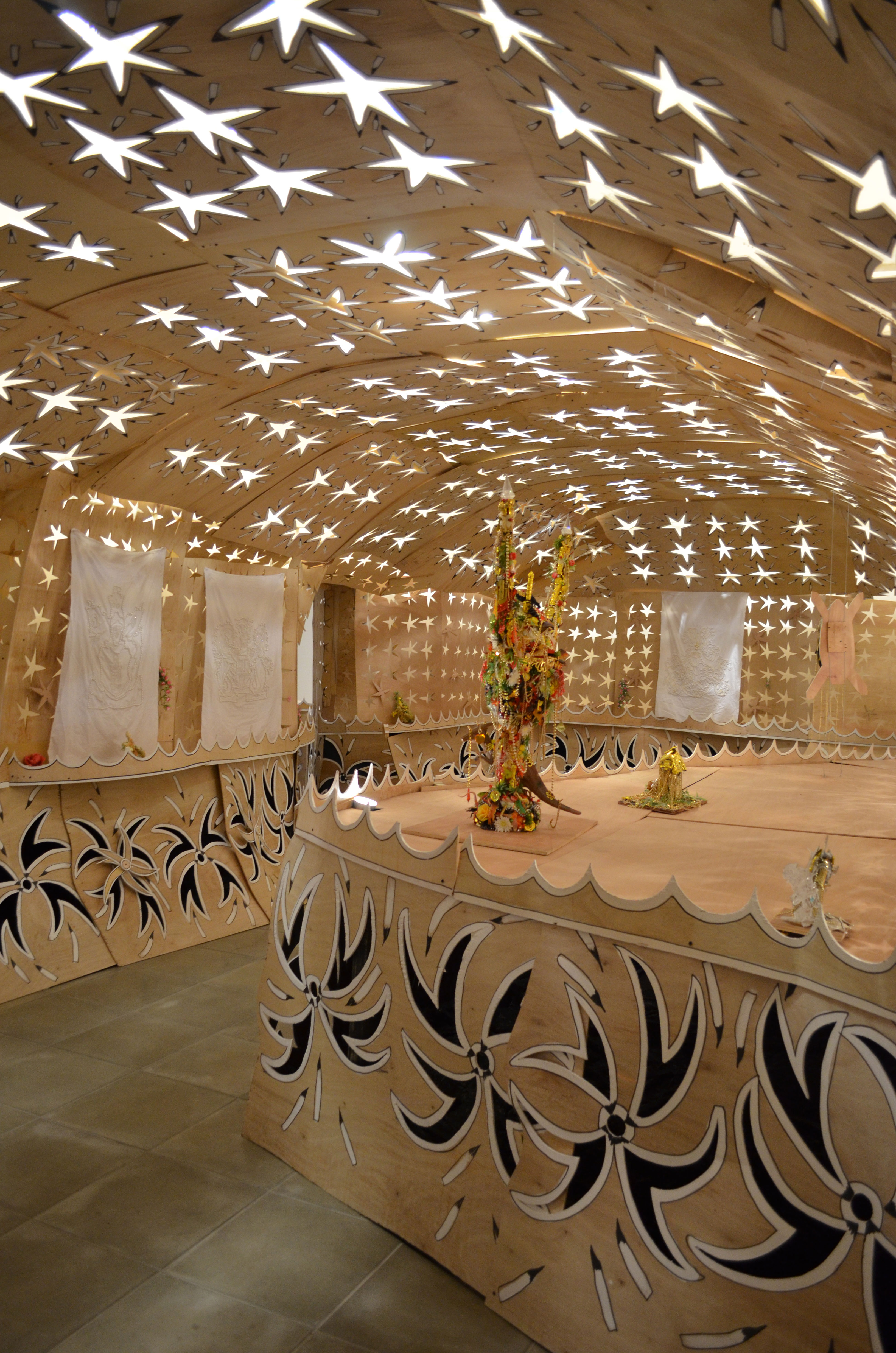Hew Locke‘s exhibition at ArtSway consists of works made of a variety of gold and silver plastic from pound shops, the most striking of which form shields with crossed swords behind, like would belong in a mediaeval castle. Additionally plastic pearl necklaces have been used to draw royal crests on plain white fabric squares that hang like Royal Standards, which could be attached to trumpets heralding the forthcoming royal wedding. Locke’s work is contained in a structure something like a bedouin tent constructed inside the gallery from sheets of plywood. Each of these is pierced by numerous large star shapes through which the gallery lighting plus some additional lights shine through, creating something closer to a planetarium.