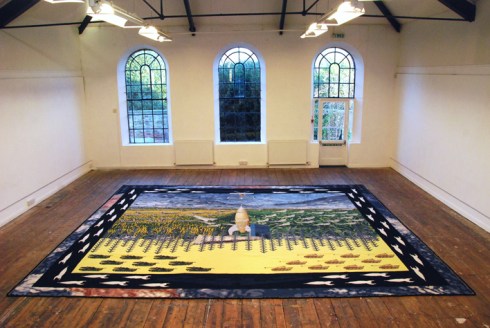 It goes against the rules of the museum to walk on a work of art, and in many heritage attractions you are prevented from walking on the carpets. In contrast to this, Carl Andre’s floor works made in a checkerboard fashion from squares of various metals are intended to be walked on by the viewer, creating an abnormal physical interaction in the gallery space, which many continue to avoid except the very young. Returning to Feio’s work, it is difficult to see the detail of a piece such as 3, 2, 1, 0 A A and away 1, 2.. (2011), shown at Bridport Arts Centre earlier this year, when exhibited on the ground. Consequently it seems these pieces are more visible and effective when hung as when Satellite (Good News-Birth and Fertility-Faith Wheels of Fortune) (2008) was recently shown at IMT Gallery alongside Kate Terry’s solo exhibition. Placing this work on the ground and walking upon it is to neglect and refute its political statements. Admittedly though, not many spaces will have a wall large enough to hang a 5m high piece on, and devising a method of hanging such a heavy textile work would be challenging, but maybe a space with a balcony from which to see the piece is required, although positioning the audience here would distance them from the subject in the way that many civilians are distanced from wars.