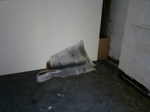 At The Mews Project Space, Margarida Gouveia has created an installation of trompe l’oeil works that make the room appear on first glance to be abandoned with upturned carpets and coir door mats discarded in the corners, which reflects upon Fischli and Weiss‘s installation Untitled (Tate) (1992-2000), where it seems the gallery is undergoing renovation but everything including tools, discarded cups, etc. is actually a sculpture. The work also curiously fits with the detritus dumped outside the space by the gallery’s neighbours, almost making this into a sculpture, amongst which is a fragment of patterned carpet or upholstery.