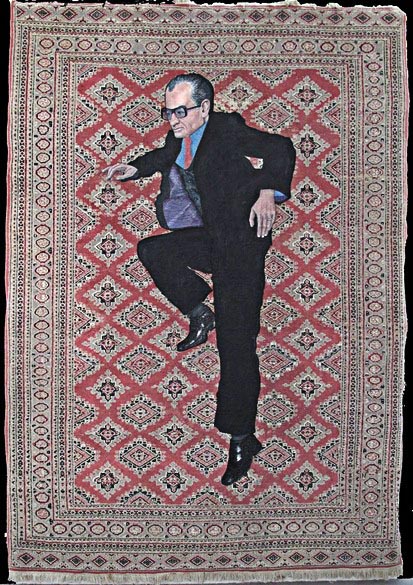 The painting is entitled The Shah of Iran 1973 (2011), depicting the Shah who in 1973 instigated an increase in the price of crude oil and was subsequently deposed in revolution in 1979. Sokhanvari’s combination of subject and material consequently reference Slavoj Zizek’s observation in a recent interview on Al Jazeera that when a ruler loses support to stay in power there is a period before he or she falls, like a cartoon character continuing to walk off a cliff until they look down and realise there is no support. The Shah is depicted (possibly) falling, as though having stepped off the magic carpet in mid-air, creating a parallel between the Shah’s fall from office and the suspended motion in Yves Klein’s Leap Into The Void (1960). Hanging the piece from the ceiling as previously suggested would signify elevating the Shah, whereas to walk upon the carpet would closer reflect the revolution that overthrew him.