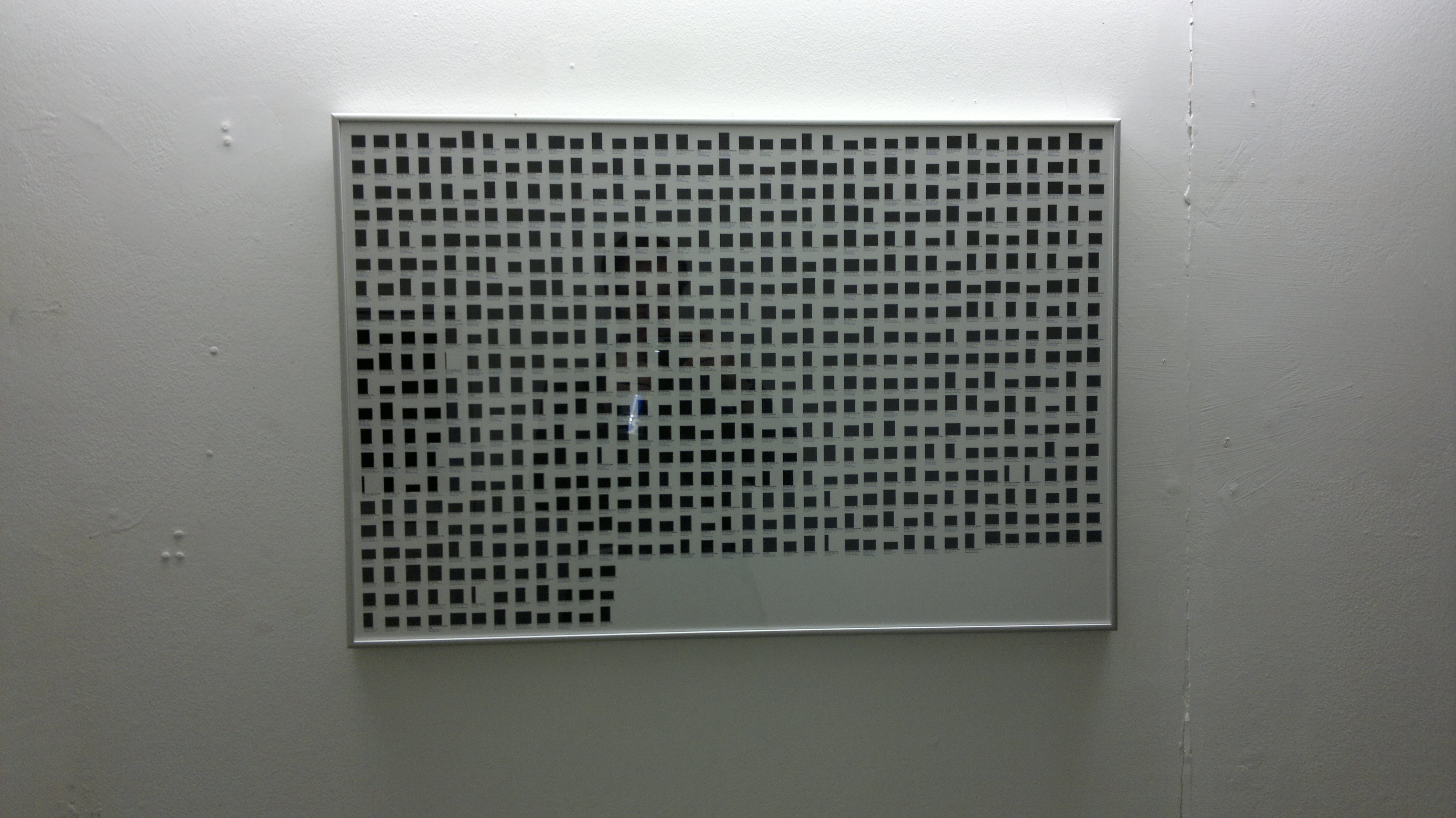 Whilst Pumhösl’s work fits within the broad nature of minimalism and perhaps Abstract Expressionism, The Mews Project Space is hosting an exhibition of monochromatic works, which critically address minimalism and its practices from within. In the first room of Dark Matter Jonathan Lewis has set out to recreate the installation conditions of Kasimir Malevich‘s seminal Suprematist exhibition, The Last Futurist Exhibition (1915), but Lewis uses only a series of prints of Black Square on White in different size and style frames and digital printing means and materials. However the focus of The End (2011) is on the pixelation of the image, which unlike Lewis’s previous work is due to the prints being taken from a very low-resolution image found online. This includes a rather bizarre square of different shade off-white pixels in each corner like an unreadable QR code or the tags within a graphic design software package for manipulating the dimensions of a selected image. Then a greyish line of pixels forms a border between the two areas, as though the image could be of a black surface over layered with a white mount board casting a slight shadow. Such is the case that online information, particularly that resourced from search engines that pick up any text on a page, can be confused between original pieces and things inspired by a master, hence it is possible that this may not be an image of the original. Consequently the work questions the capability of communication of knowledge and ideas through the internet and the actual minimalism of artworks including Malevich’s. Do they conform to machine-accurate straight lines or is the presence of human nature visible in brushstrokes and minor imperfections?