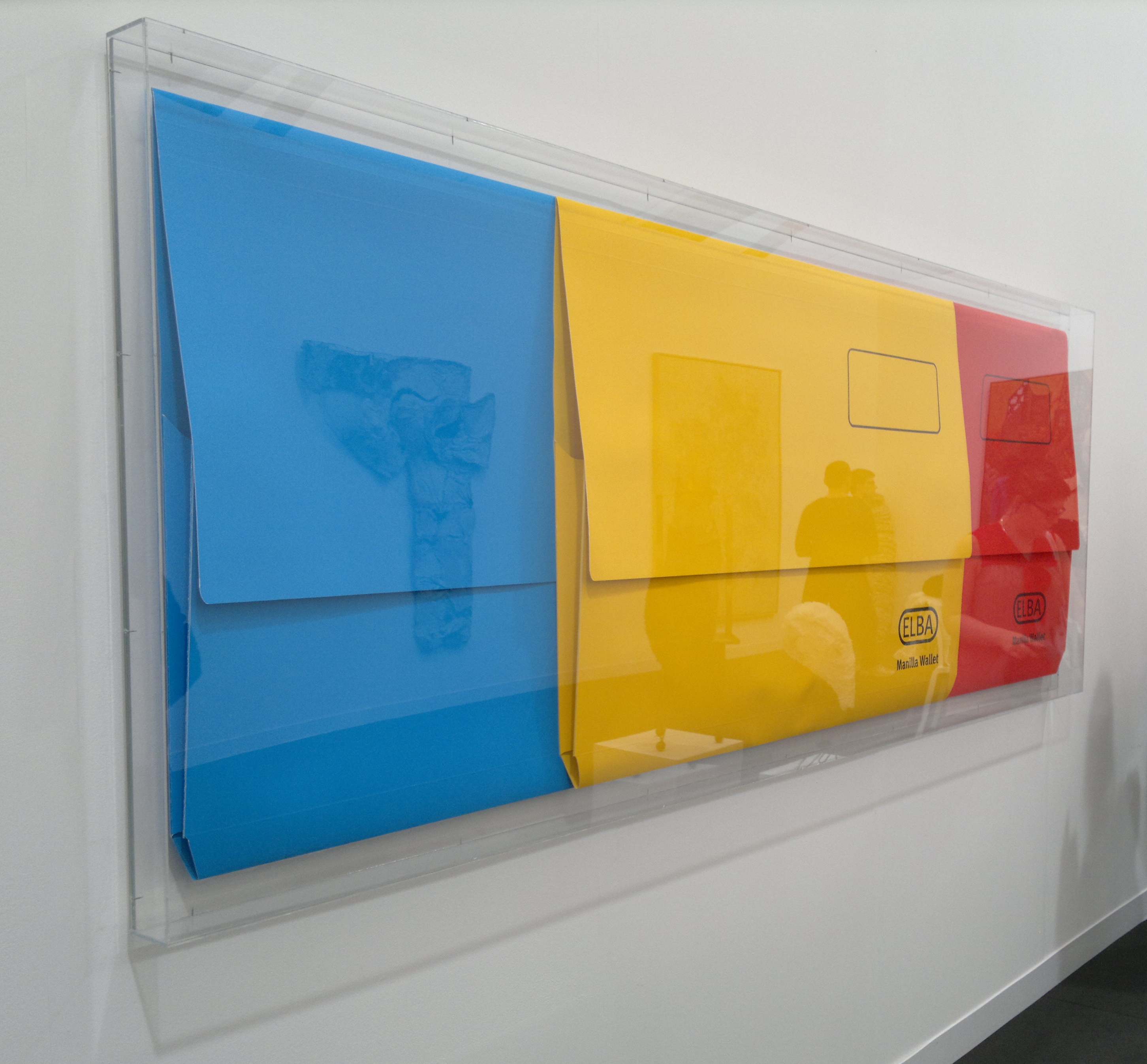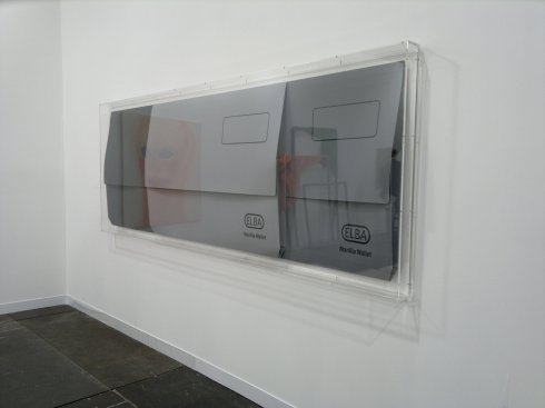 Untitled (Shelter) (2011) prominently features two giant credit cards with raised numbering that have been cut up into strips and mixed up with similar strips of polished marble with curved corners that resonate with the cards. Hence it is apparent that besides the financial politics surrounding credit cards, Kuri is also interested in the throwaway nature of western society and the longevity of plastic and stone materials. Indeed it seems likely that the numbered cards were discarded promotional material, which Kuri has de-branded with black paint, something of a political statement regarding the misery of debt, the current lack of credit, and banks considering loans as assets. Additionally the marble may be left over from a kitchen worktop or gravestone and two drinks cans are crushed between some of the stones. This resonates with Paolo Cirio‘s P2P Gift Credit Card featured in The Art of Selling and the Selling of Art and Michael Landy‘s Credit Card Destroying Machine at the Frieze Art Fair that cut up a credit card in exchange for an automatically produced drawing. Meanwhile these oversized credit cards are also tantamount to Scott Myle’s work The Past from Above (Elba Grey 1), a trio of A1 sized replicas of branded manilla wallets or folders in three monochromatic tones seen on the Meyer Riegger stand at Frieze, along with a similar work in the three primary colours on The Breeder stand. It seems as though this work may have been a witty, literal response to someone asking to see Myle’s portfolio, questioning whether what is inside counts, or if first impressions are all important.