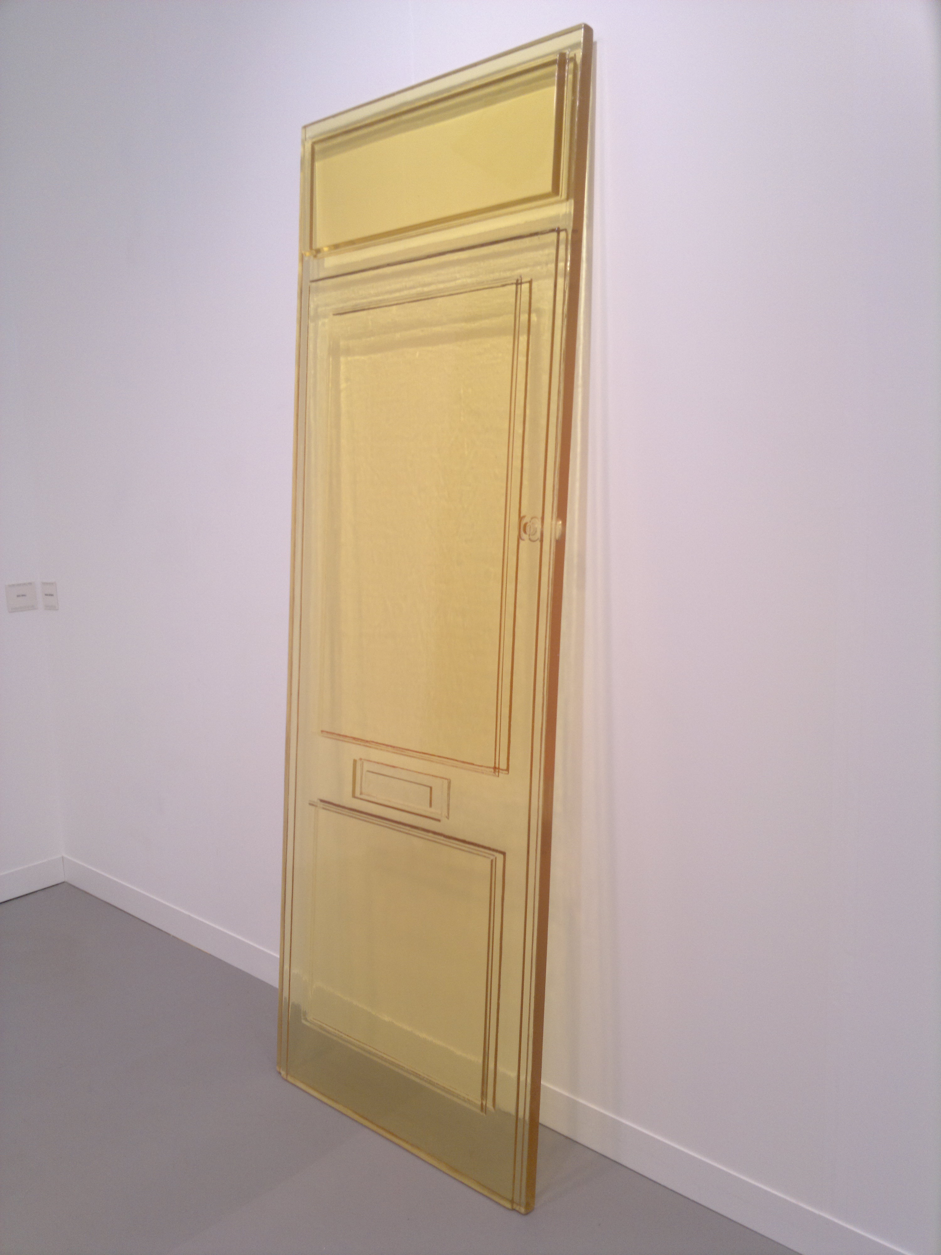 Finally, a door cast by Rachel Whiteread leans against the wall in the Galleria Lorcan O’Neill stand at Frieze, much like Joseph Kosuth’s Any 2m Square of Glass Leant Against Any Wall passed somewhere else in the fair. This is again solid and impassable, yet the fact it is leant against the wall perhaps suggests it has been forcibly removed from its frame and that where it previously stood can now be passed. It is also similarly transparent.