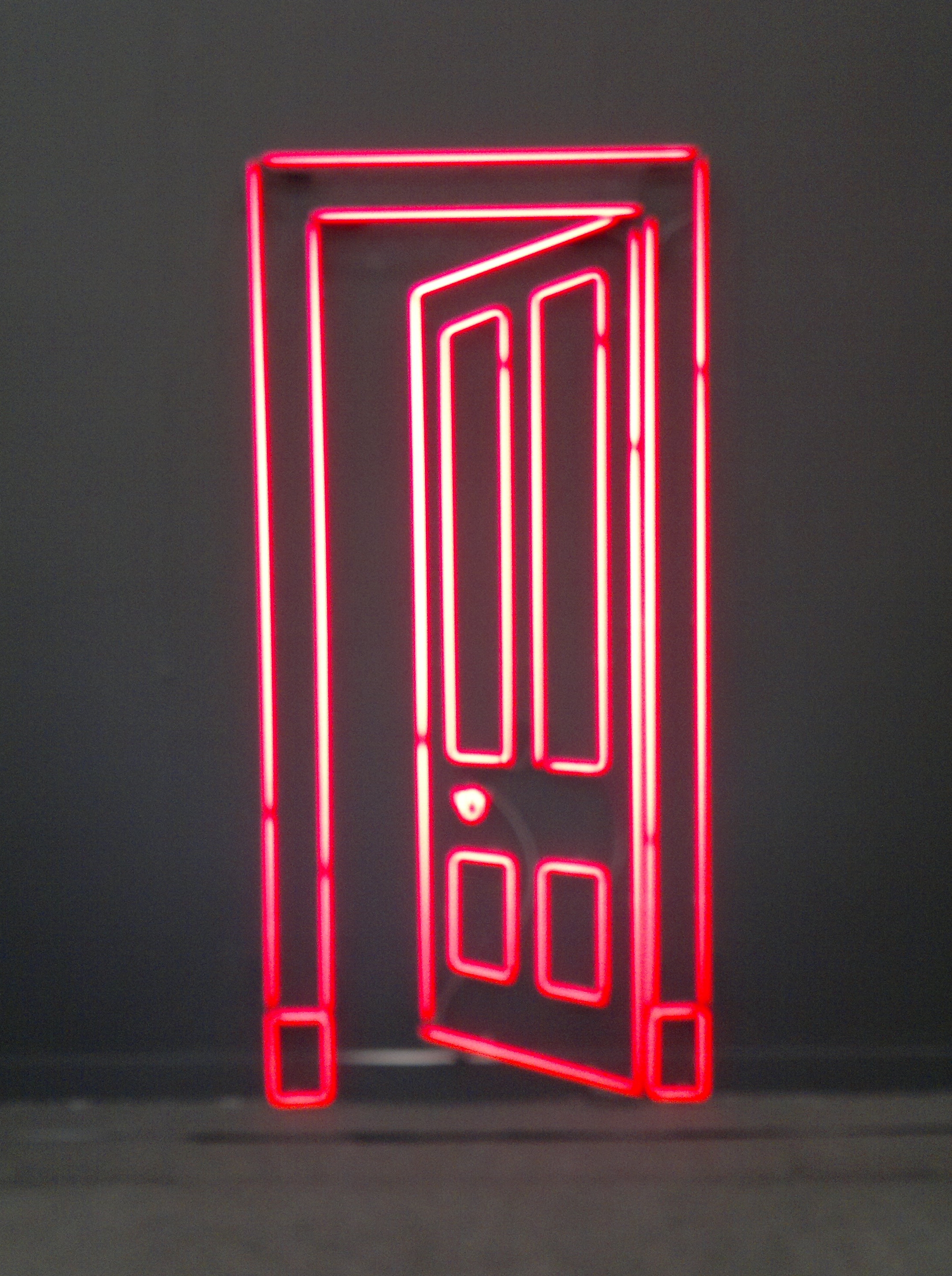 Back at Frieze London, Gavin Turk’s work appears on both the Almine Rech Gallery and Aurel Scheibler stands, both depicting partially open doors. The first work is a flat neon light outline that appears to lead beyond the gallery wall like a trompe-l’oeil painting, however if you were to try to enter this space you would probably smash the work. Meanwhile, Small Door (Olive & Grey) (2012) on the Scheibler stand is a miniature physical embodiment of a door, lodged permanently half open in a door frame. With evidence of wear to the paintwork and physical material of the door embodied in the work, together with the panelling of the door, this clearly represents an old and frequently passed through space, yet Turk has cast this transient space, or Non-Place as Marc Augé would refer with his book available from the Koenig Books stand in the fair, in bronze so that it is fixed partially open, allowing some but not all to enter. A life-size version of this work was installed at Snap 2012 in June at Aldeburgh Festival, Snape Maltings.
