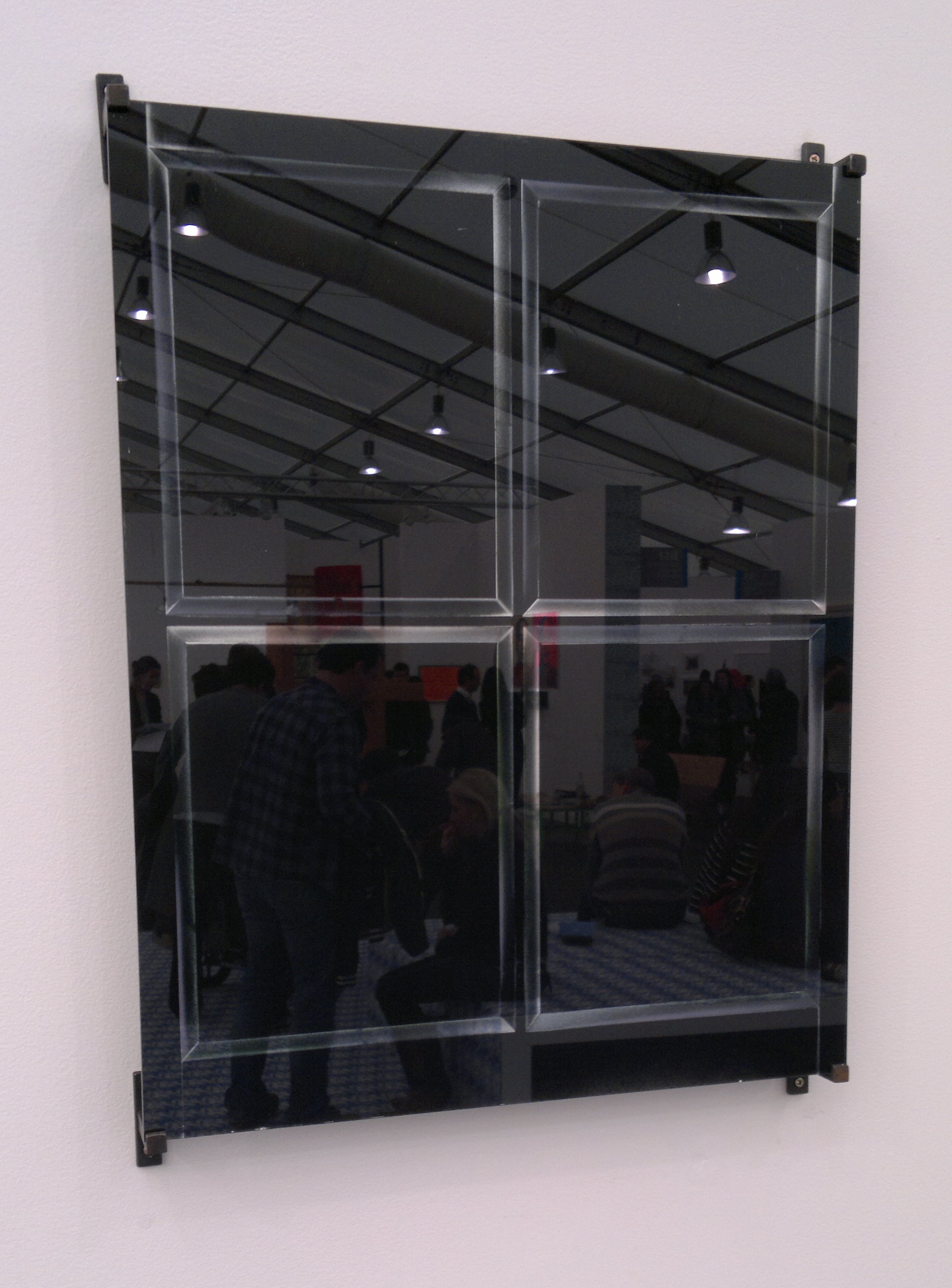 Jan Mancuska’s Window Vol III. from daily newspaper, January 2008 (2008) on the Meyer Riegger stand is a ponderous physical construction of a pair of windows rendered with a vanishing point. Viewed from the edge of the stand as in the above photograph, they appear to be nothing more than windows, but from front on they are a conjoined work, getting increasingly taller the further you go in, contorting or elongating a space, depending on which way they are viewed. The handles have even been custom made to have diagonal edges to match.