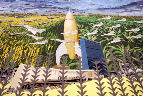 Carlos Noronha Feio has designed a series of Arraiolos carpets, which depict images of modern technology that may be used in war such as jet fighter planes, tanks, rockets and satellites, although they can also have many other peaceful technological and exploratory functions. This is highly political work, like the doormat-size carpet seen in the window of a Mayfair carpet dealers depicting a United States Five Dollar Bill across its entire width, which offers conflicting potential views of American patronism and luxury, versas walking over a past president and abandoning capitalism or commercialism. In Feio’s work the blood shed by those on the front line, along with civilian casualties in situations such as the dropping of the atomic bomb in Hiroshima, is interwoven with that of the carpet makers, whilst Feio seemingly keeps his hands clean in designing the piece like a political or military leader. This work consequently seems to question the reason for the existence and production of the depicted things, as the ownership of nuclear defence weapons seems questionable when no one would want to use them, and hence the work also addresses man as his own worst enemy.